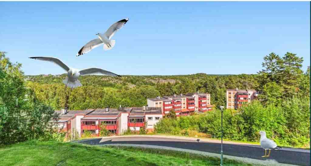 Vi bor i et høytliggende boligområde nær sjøen, noe som gir svært gode forhold for måker. Kombinasjonen av nærhet til kysten, åpne grøntområder og høye bygninger gjør at måkene oppfatter området som et trygt og attraktivt sted for hekking. Blokkbebyggelsen er oppført i betong med fasader i aluminium, og takene har tekniske installasjoner og takvifter som utgjør de høyeste punktene i området – dette er spesielt attraktivt for måker som søker oversikt og trygghet.
